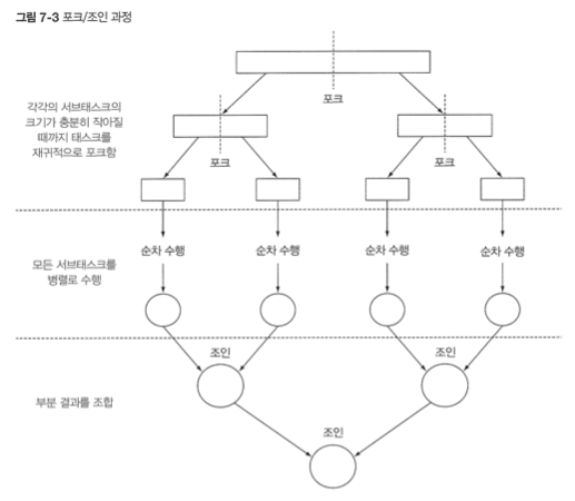 포크 / 조인 프레임워크에서는 task를 작은 task로 분할한 다음에 각각의 스레드로 실행하여 결과를 합쳐서 최종 결과를 생산한다.